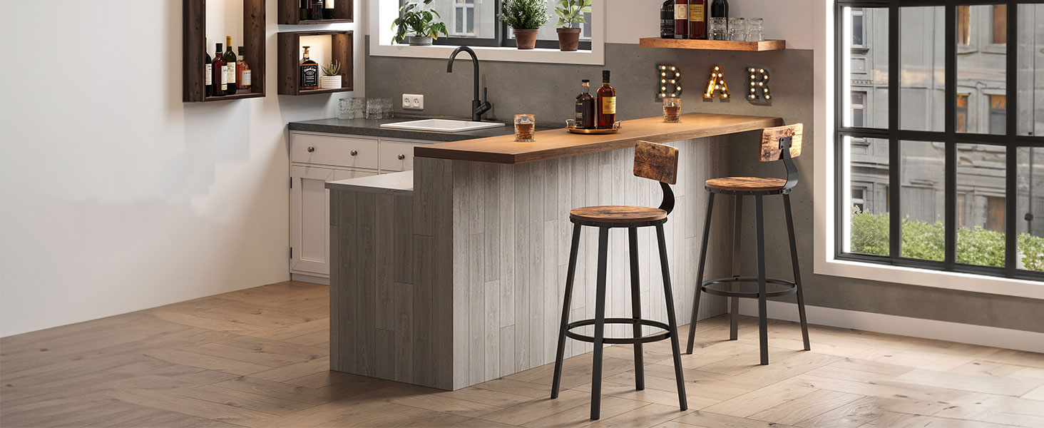 Rustikaalne stiil Oma vintage-pruuni viimistluse, musta metallraami ja dekoratiivsete neetidega sobivad need industriaalses stiilis kõrged taburetid ideaalselt teie kodubaari, kööki või söögituppa.