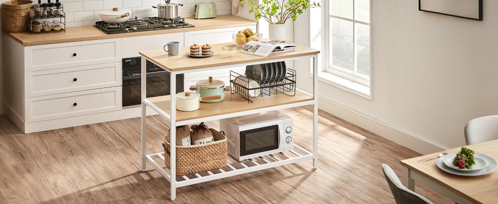 - 3-astmeline hoiustamine: Aseta lillevaas või teeserviis ülemisele riiulile, köögiseadmed keskmisele ja küpsetusnõud alumisele riiulile – kõik on kenasti organiseeritud sellel 3-tasandilisel köögiriiulil.