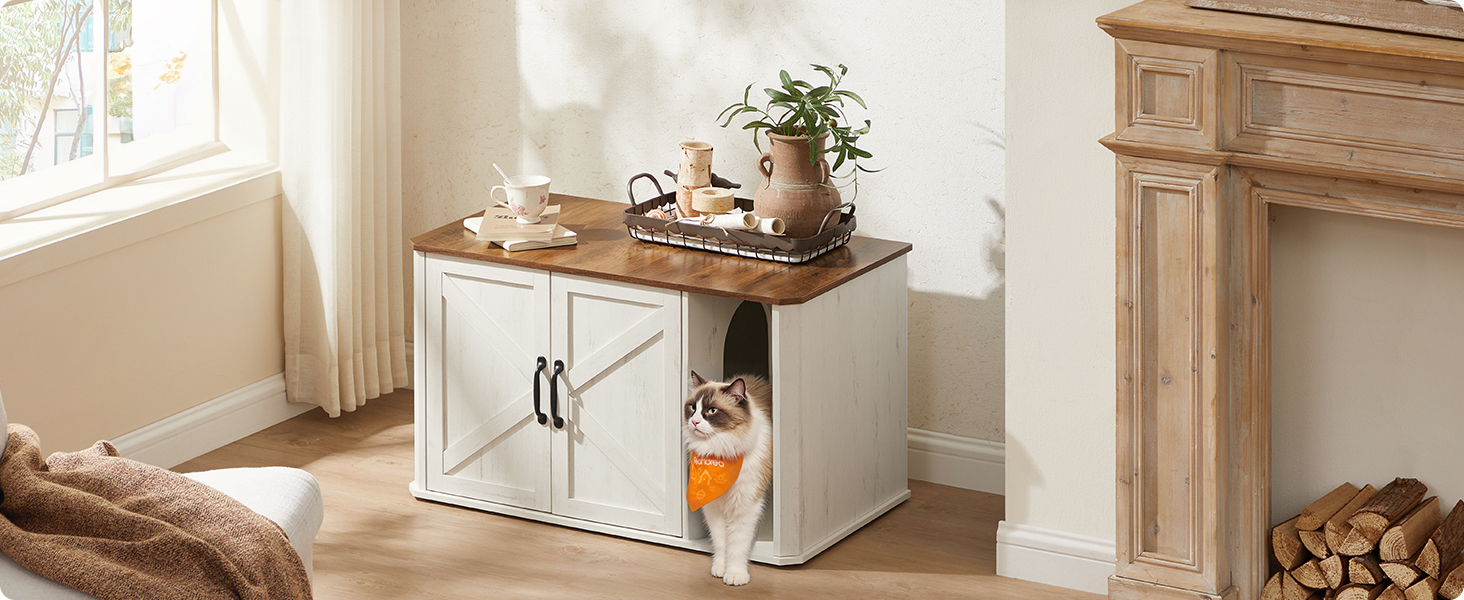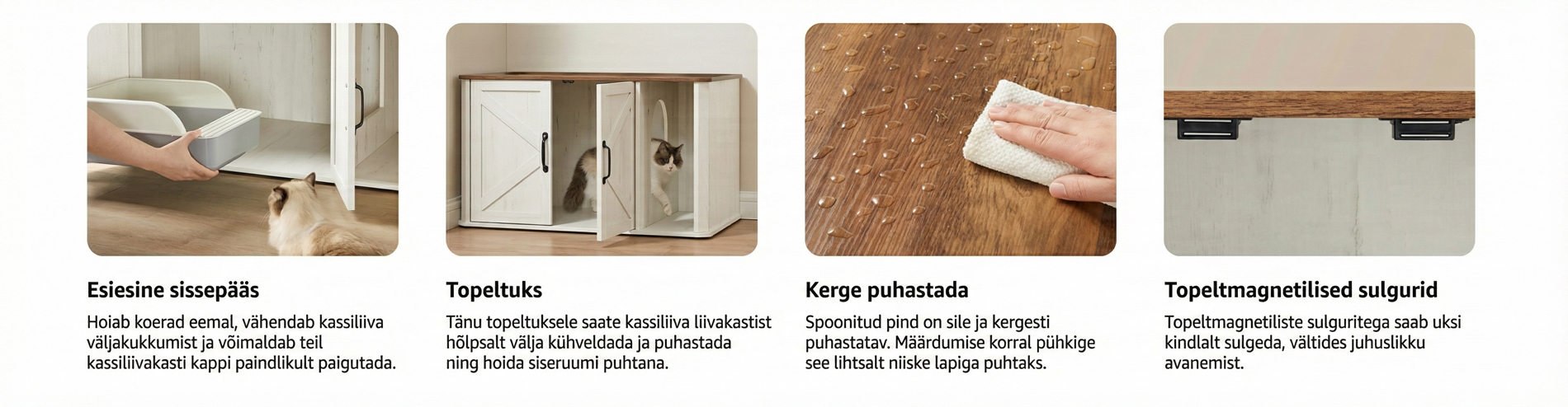 LOODUD SUURTE KASSIDE JAOKS Mõõtudega 59 x 45 x 47 cm sobib sisemus enamiku liivakastide jaoks ja sobib ideaalselt suurtele kassitõugudele, näiteks Maine Coonidele. Kvaliteetsest puitlaastplaadist kapi ülemine paneel toetab kuni 75 kg.