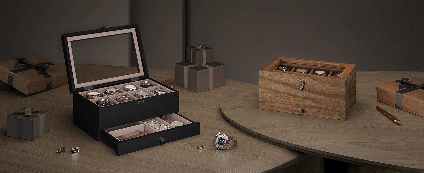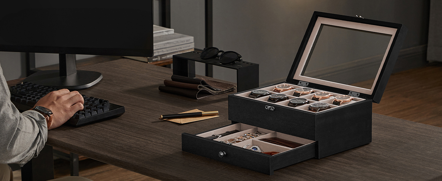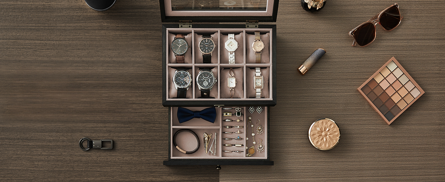 Suur mahutavus ja hoiuruum kahel tasandil Ülemisel tasandil on 8 sektsiooni kellade jaoks, alumisel tasandil erineva suurusega sektsioonid kellarihmade, sõrmuste ja mansetinööpide jaoks – hoides nii teie kellad kui ka ehted hästi organiseerituna.