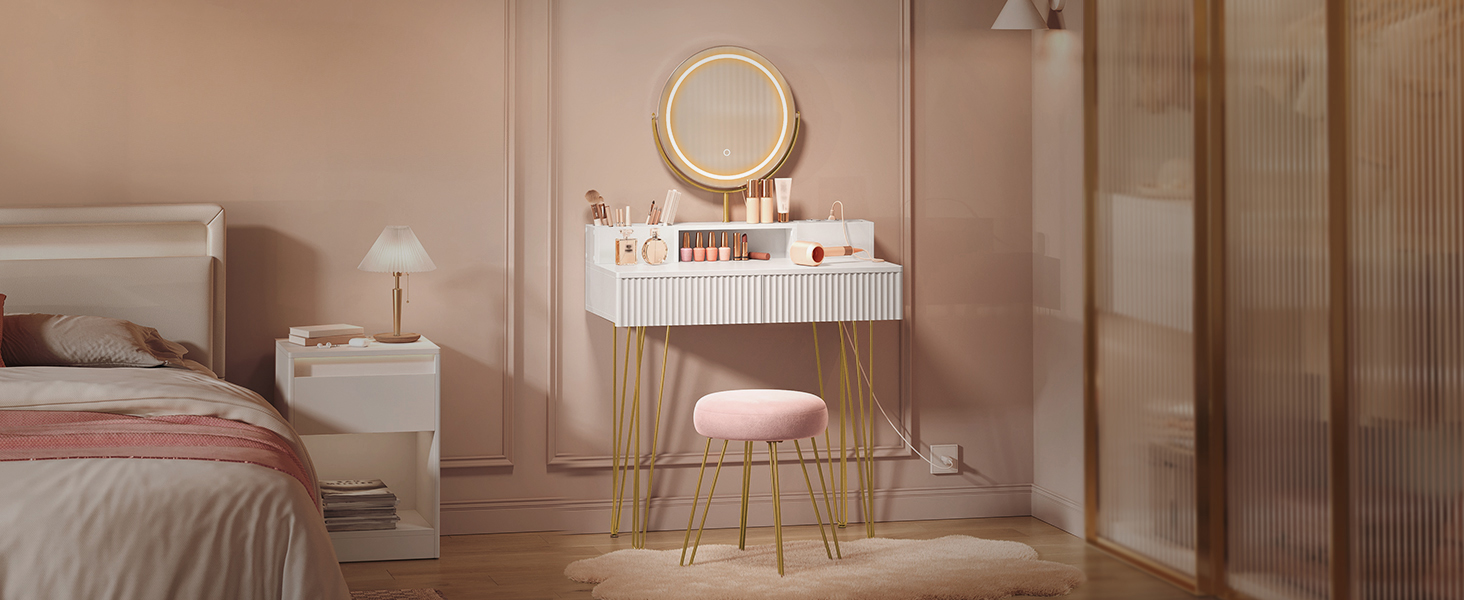 ROHKELT PANIPAIGALAUD Avar lauaplaat, 2 suurt sahtlit, 1 korraldaja 4 väikese sektsiooniga ja 1 avatud riiul – see tualettlaud pakub palju ruumi teie kosmeetikale. Kõik saab hoiustada korralikult ja käeulatuses.