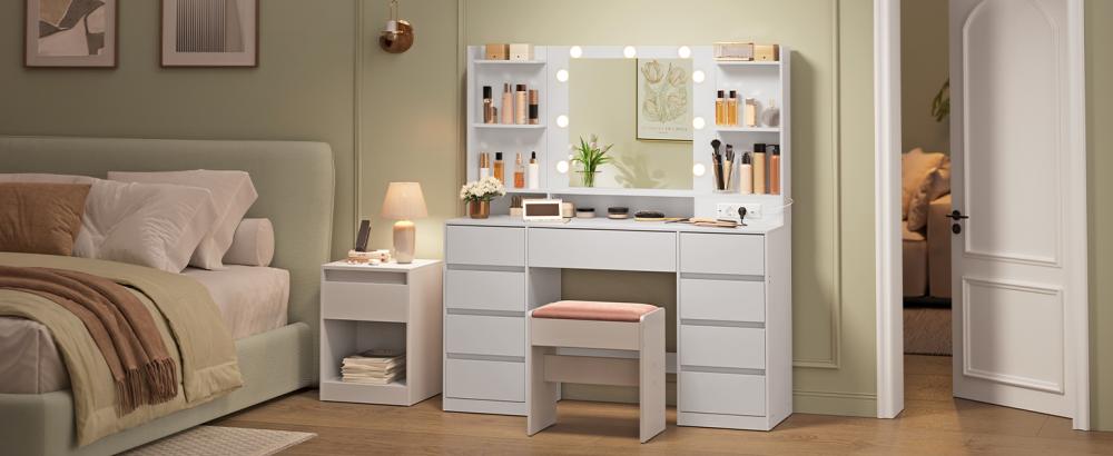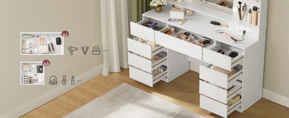 - Rohkelt hoiuruumi: 107 cm laiuse lauaplaadi, 9 sahtli ja 8 avatud sektsiooniga pakub see tualettlaud piisavalt ruumi teie ilutoodetele.