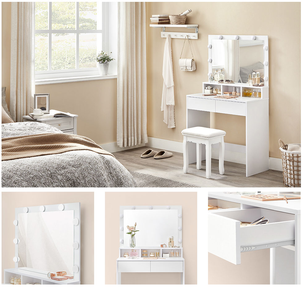 Rohkelt ruumi: 1 kõrgendatud riiuli, 3 avatud sektsiooni, 2 sügava sahtli ja 1 tasapinnaga tualettlaud pakub teile palju ruumi huulepulga, lauvärvi, jumestuskreemi, küünelaki ja muude ilutoodete korralikuks hoiustamiseks.