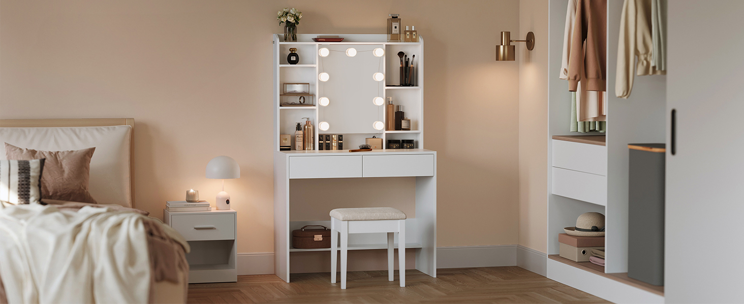 Tugev ja vastupidav Kvaliteetsest puitlaastplaadist valmistatud tualettlaud pakub suurt stabiilsust ja toetab teie ilurutiini aastaid.