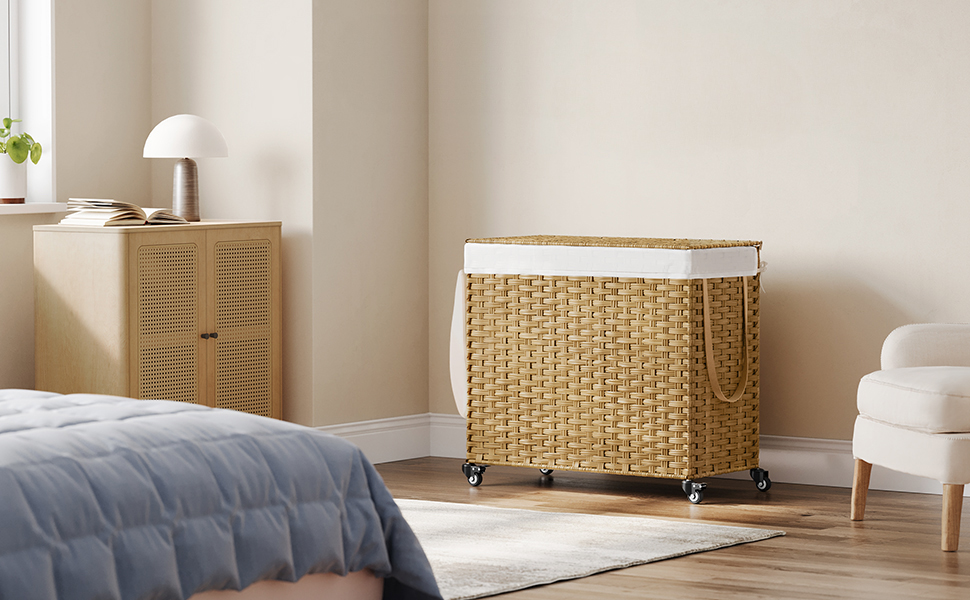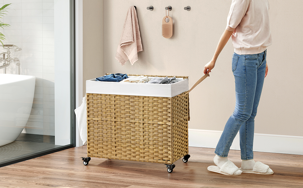 Pesukorv kaanega, 160 L, 3 sektsiooni, ratastel, rotangimitatsioon, eemaldatav kott, naturaalne toon