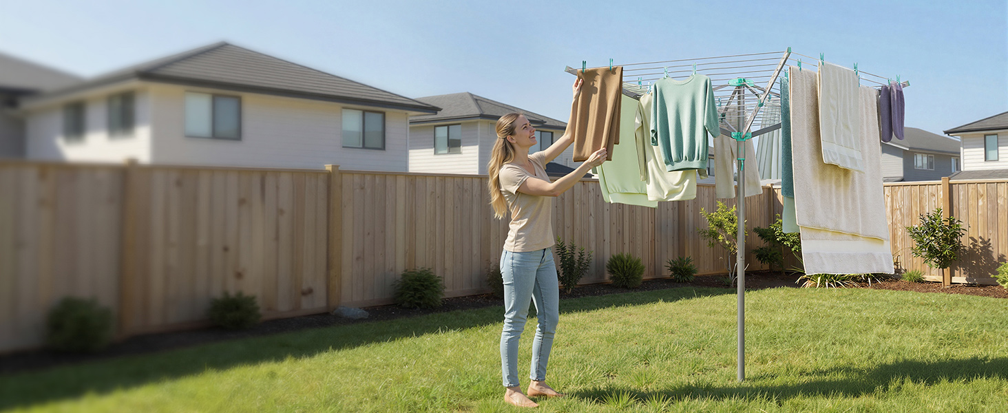 Suur kuivatusala: 60 m pikkuse kuivatusnööriga on ruumi 6 pesukorrale, mis sobib ideaalselt peredele. Lisaks on komplektis 36 pesulõksu koos väikese hoiukotiga, et sokid ja väikesed esemed kindlalt ripuksid ning pesulõksud ei läheks kaotsi.