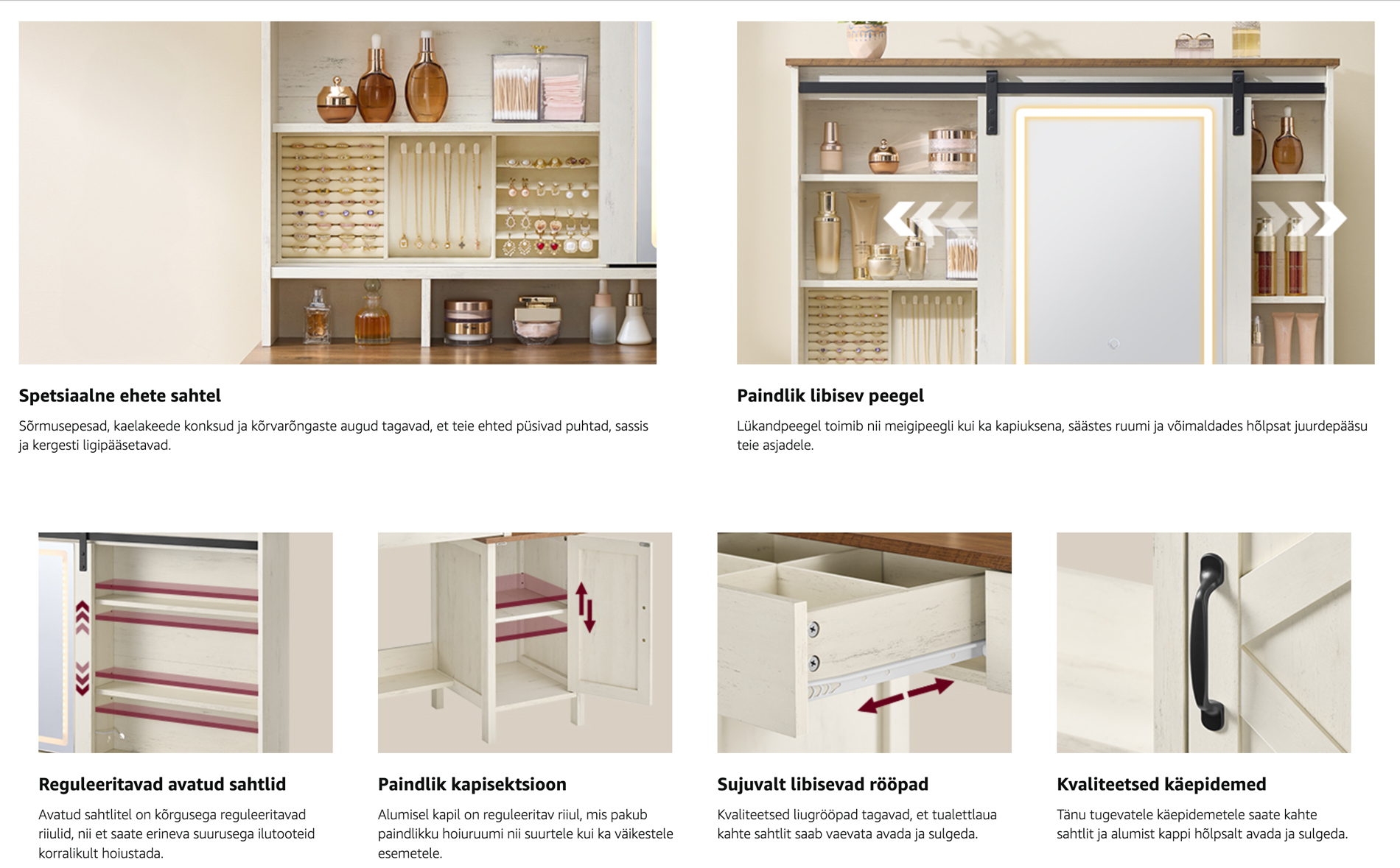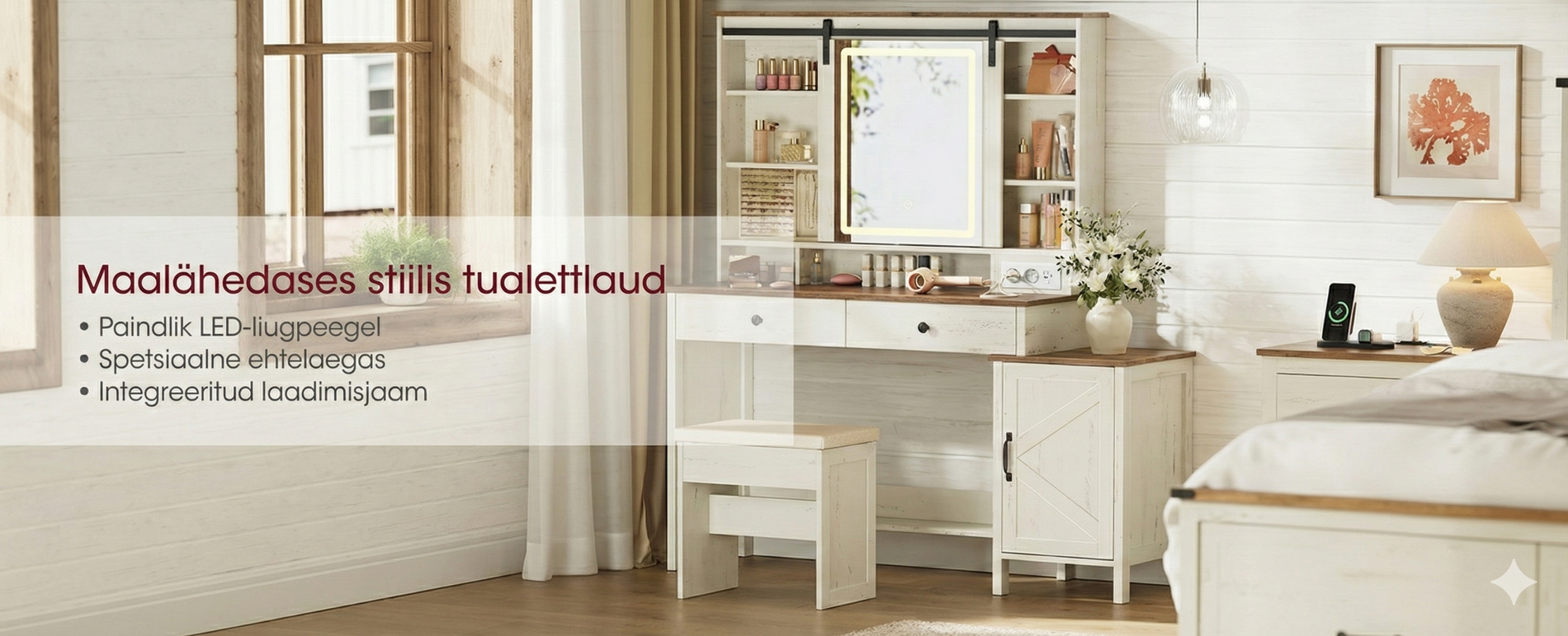 Rohkelt hoiuruumi: Tualettlaud hoiab kõik teie ilutarbed korras ja käeulatuses – 100 cm laiuse lauaplaadi, kahe sahtli, külgkapi, seitsme avatud sektsiooni ning üleval ja all riiulitega.