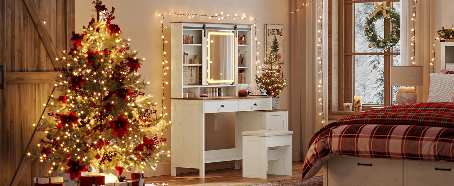 Tualettlaud peegli ja LED-valgustusega – maamaja stiilis taburetiga, laadimisjaamaga, 2 sahtli ja ehete hoiustamisega, vintage valge/meepruun