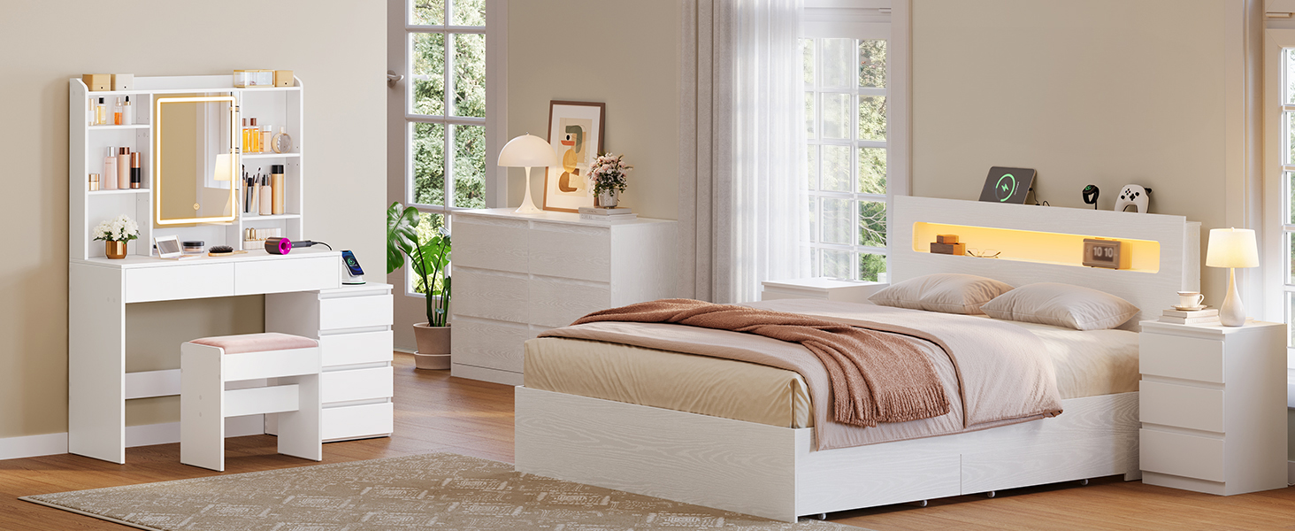 MODERNNE JA MINIMALIST: Avasta KAILYN kollektsioon. Tasakaalustatud kombinatsioon säravvalgest, siledatest pindadest ja käepidemeteta sahtlitest. Kombineeri see tualettlaud teiste sama sarja mööbliesemetega, et luua harmooniline interjöör.