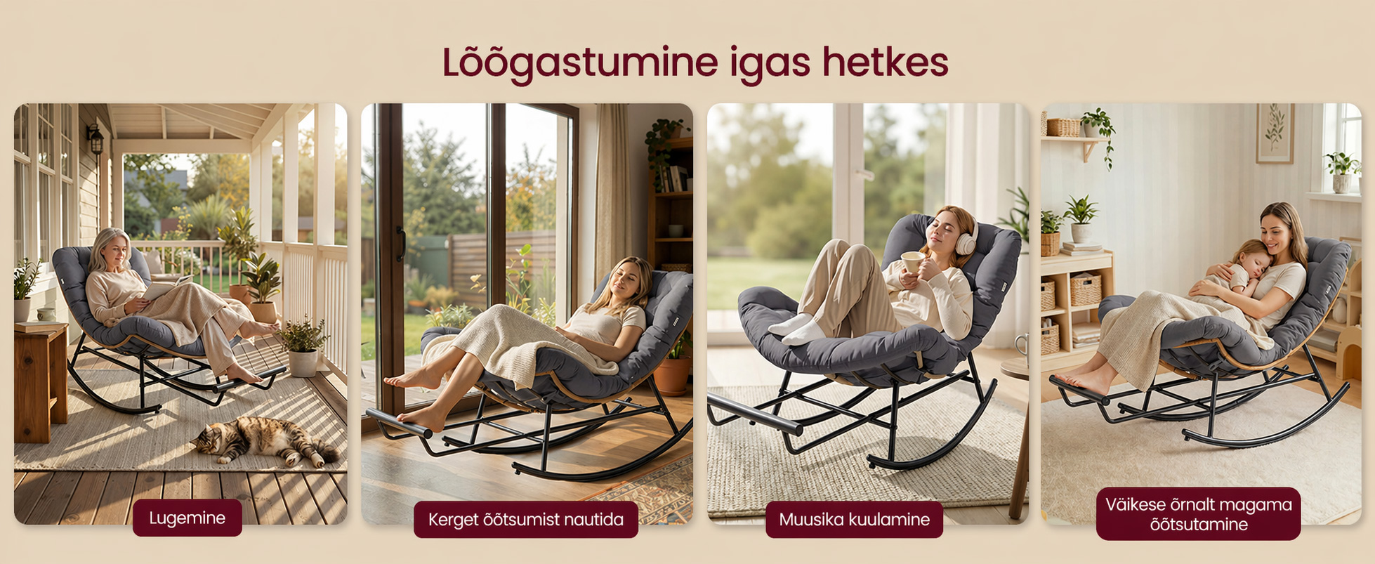 Ergonoomiline ja survet leevendav: Hästi polsterdatud kiiktool on ergonoomilise kujuga ja kohandub ideaalselt keha kontuuridega, leevendades märgatavalt survet. Õrn kiikumine tagab tasakaalustatud mugavuse – ilma ümberminekutundeta.