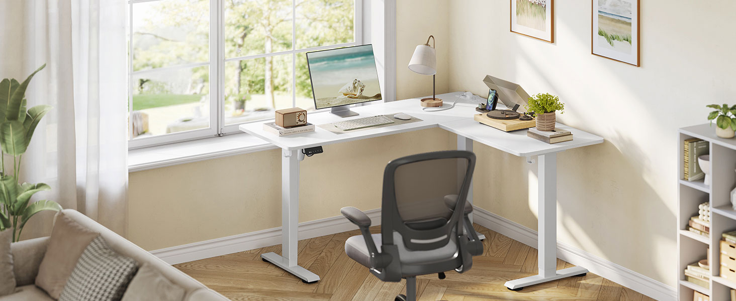 Reguleeritava kõrgusega elektriline nurgalaud 140 x 160 cm, L-kujuline, laadimisjaamaga, 2 kõrguse mälufunktsioon, kodukontorisse, valge