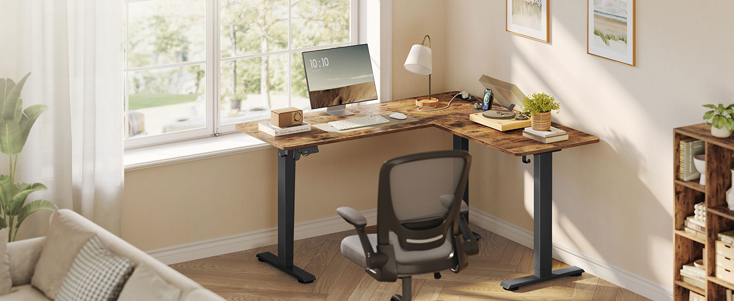 Reguleeritava kõrgusega elektriline nurgalaud 140 x 160 cm, L-kujuline, laadimisjaamaga, 2 kõrguse mälufunktsioon, kodukontorisse, vintage-pruun/tindimust