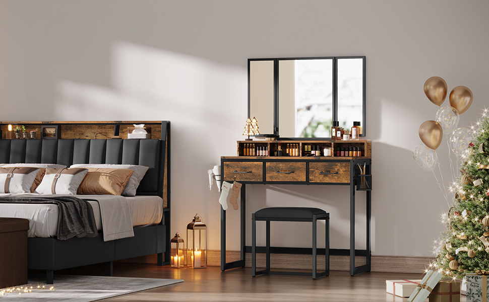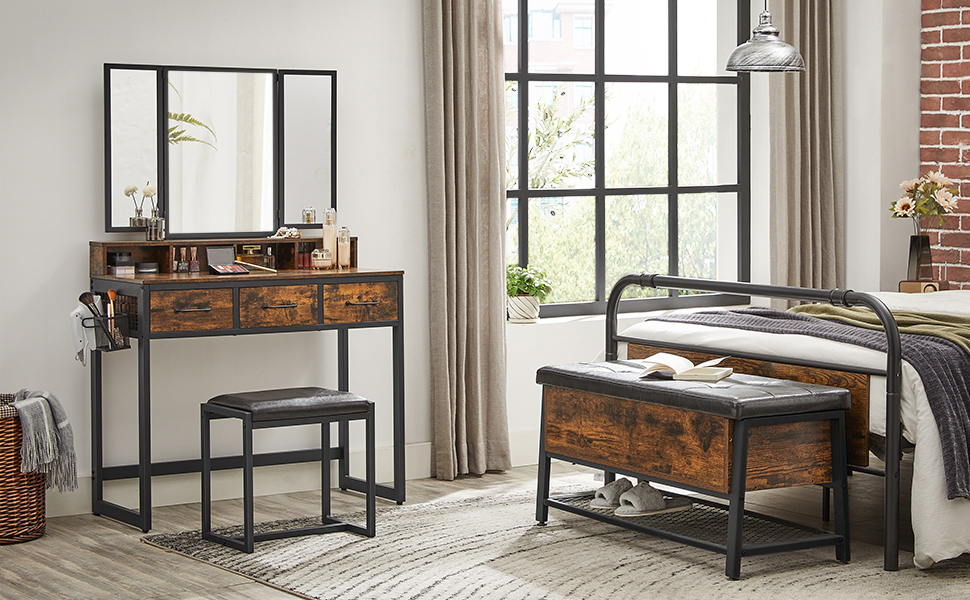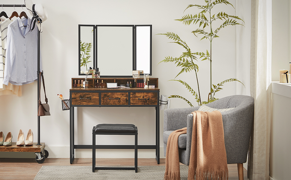 Tualettlaud peegli ja taburetiga, kolmeosaline peegel, 3 sahtlit, föönihoidik, industriaalne, maalähedane pruun ja must