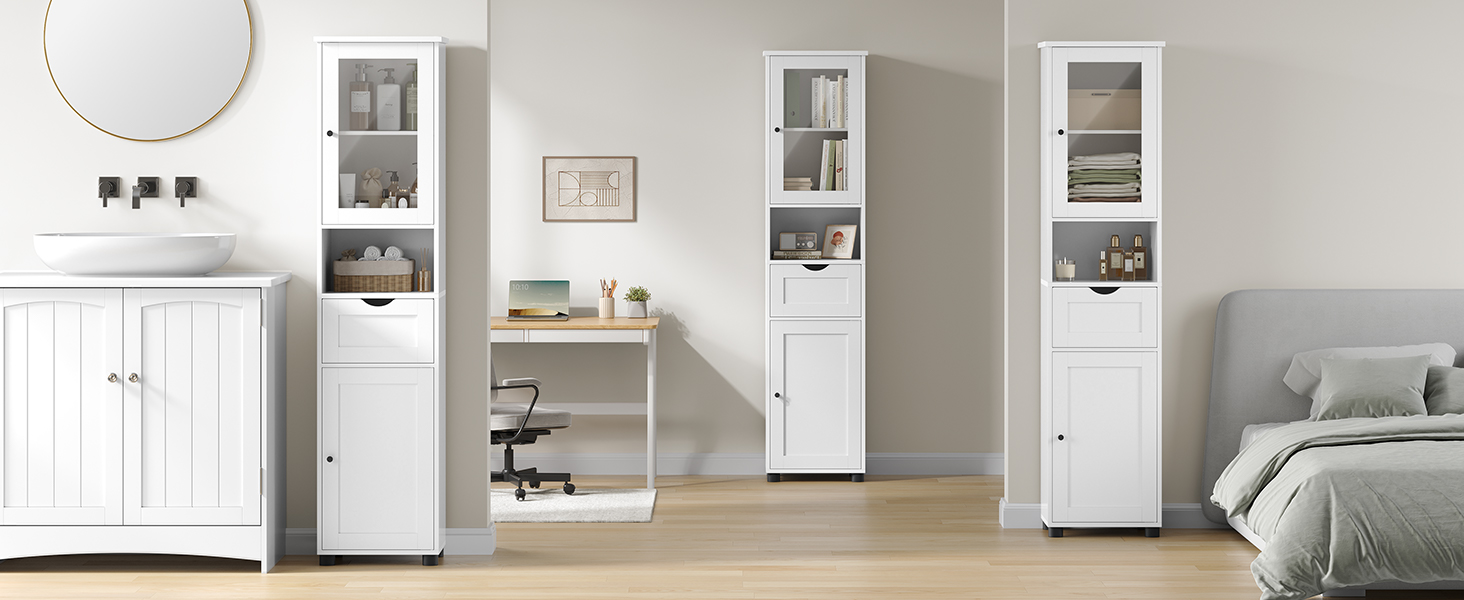 Värskuse ja elegantsi hõng Pilvivalge pind, stiilne klaasuks – see kõrge kapp lisab teie vannituppa meeldivalt värske ja elegantse ilme.